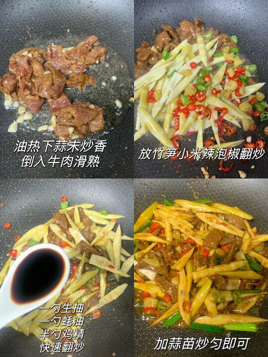 [吧唧R][吧唧R]牛肉炒竹笋真的好好吃!无敌下饭![害羞R]竹笋爽脆,牛肉入味,没吃过的一定要试试!!我真的超爱~ 食材:牛肉、竹笋(我买的超市袋装的)、小米辣、蒜、青椒、泡椒、蒜苗 腌制牛肉:一勺生抽➕勺料酒➕半勺蚝油➕半勺老抽➕一勺淀粉搅拌均匀,加一勺食用油腌制10分钟 做法: 1⃣️油热加蒜末爆香,加牛肉滑熟 2⃣️加入竹笋、青红辣椒、泡椒快速翻炒,加一勺生抽、一勺蚝油翻炒均匀,撒上蒜末炒匀即可 [彩虹R][彩虹R]是不是有手就会~快去试试吧[派对R]