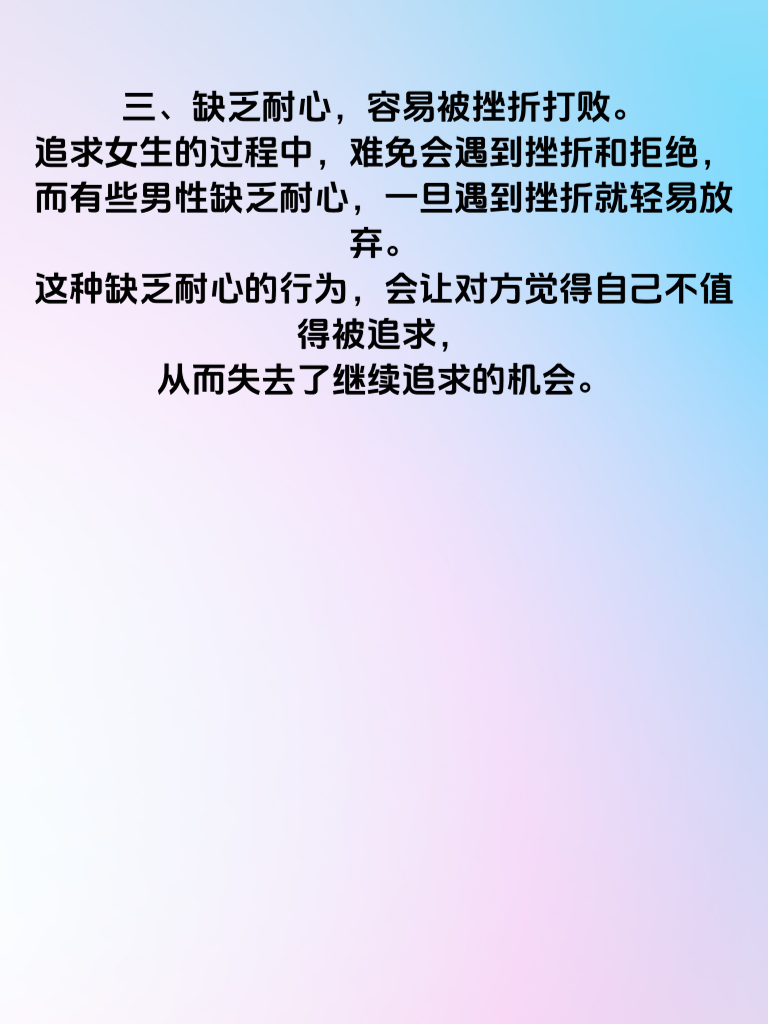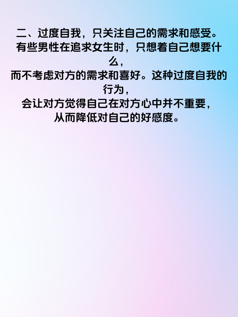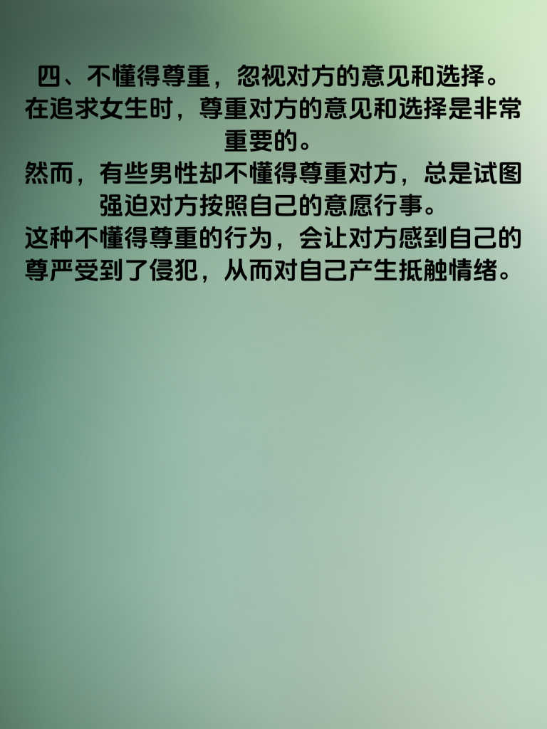 一、急于求成,忽略了情感的自然发展节奏。很多男性在追求女生时,恨不得立刻让对方答应自己的追求,而忽视了对方的感受和反应。这种急于求成的心态,往往会让对方感到压力,从而对自己产生反感。 二、过度自我,只关注自己的需求和感受。有些男性在追求女生时,只想着自己想要什么,而不考虑对方的需求和喜好。这种过度自我的行为,会让对方觉得自己在对方心中并不重要,从而降低对自己的好感度。 三、缺乏耐心,容易被挫折打败。追求女生的过程中,难免会遇到挫折和拒绝,而有些男性缺乏耐心,一旦遇到挫折就轻易放弃。这种缺乏耐心的行为,会让对方觉得自己不值得被追求,从而失去了继续追求的机会。 四、不懂得尊重,忽视对方的意见和选择。在追求女生时,尊重对方的意见和选择是非常重要的。然而,有些男性却不懂得尊重对方,总是试图强迫对方按照自己的意愿行事。这种不懂得尊重的行为,会让对方感到自己的尊严受到了侵犯,从而对自己产生抵触情绪。 五、过于计较得失,心态失衡。有些男性在追求女生时,过于计较得失,总是想着自己能从对方那里得到什么,而忽略了自己能为对方付出什么。这种过于计较得失的心态,会让对方觉得自己很功利,从而对自己产生不信任感。