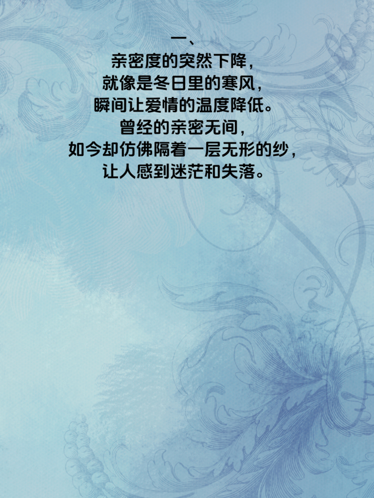 一、亲密度的突然下降,就像是冬日里的寒风,瞬间让爱情的温度降低。曾经的亲密无间,如今却仿佛隔着一层无形的纱,让人感到迷茫和失落。 二、爱情变凉的预警信号开始显现,比如交流的减少,曾经的彻夜长谈变成了简短的问候,那种心灵的契合感也在逐渐消逝。 三、曾经的甜蜜举动变得陌生,不再有那些温暖的拥抱和深情的眼神,取而代之的是冷漠和疏离。 四、这种亲密度的骤降和爱情的变凉,让人心痛不已,但也提醒着我们要及时去反思和挽回,不要让爱情在冷漠中消逝。