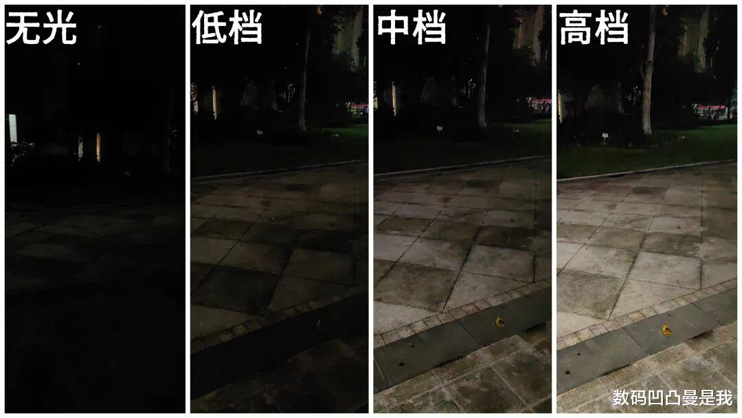 户外照明测试,无光环境下手机拍照基本是一团黑,开启低亮档可以进行小幅照明,中亮档能完全看清眼前,高亮档则可以看到远处。