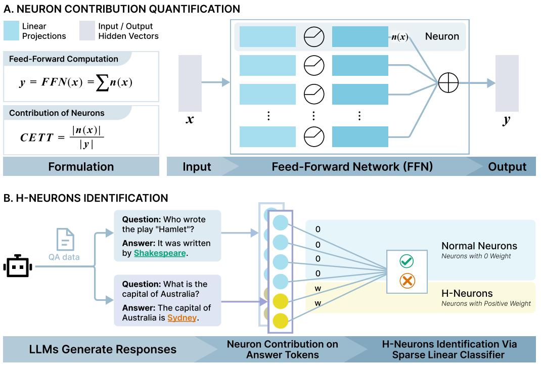 此前,人们大多从整体上研究这个问题,比如检查训练数据是否有偏差,或者让 AI 自己输出置信度。但是,这就像只知道一个人发烧,却不知道哪个器官感染了一样。本次清华团队的创新之处在于,他们决定拿起显微镜直接去观察 AI 大脑内部里的数千万甚至数亿个神经元,看看当 AI 在撒谎的时候,到底是哪些神经元在活跃。