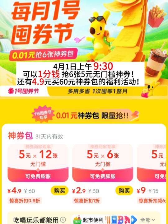 我妈是点外卖的强烈拥趸者😶‍🌫️ 跟我说:没事别下厨 点点外卖就行了🦘 别的阿姨:哎呦哪如自己做的放心 我妈:别人做饭要钱 小Q做饭要命啊[完啦R] 阿姨:你太夸张了吧 我妈:小Q你报菜名给阿姨听 我:巧克力韭菜馅饼🍫 阿姨:嗯...甜咸搭配 吃饭不累 也能吃[抽泣R] 我:关东煮调料泡五仁月饼🥮 阿姨:嗯...关东煮调料煮鞋垫都好吃 五仁月饼也难吃不到哪里去[抽泣R] 我:决战臭豆腐之巅! 阿姨:这名字听着像个大菜!怎么做的 我:买来几瓶臭豆腐罐头 掺到一起 就会变得闻起来更臭 吃起来更香 阿姨:呕...你还是点外卖吧🤮 我妈:最可怕的是 我怀疑她没有味觉🤮 她吃这些东西都吃的喷香 实在太可怕了... 我:阿姨下次你来我家 我给你做饭吃! 阿姨:别闹孩子... 我才刚领上退休金🥺 我给你在那个美团外卖软件上买点神券吧 你放过阿姨 也放过自己的胃吧! 我:阿姨你现在别买 你等着4月1日美团囤券节买 1次就可以囤够1整月的神券! 打开美团或美团外卖 搜索【囤券节】 4月1日上午9:30 可以1分钱抢6张5元无门槛神券! 午餐、晚餐、夜宵等多时段 有超大概率可将其膨胀为 满29减15元外卖膨胀神券! 还有4.9元买60元神券包的福利活动 实在是多囤多省多优惠! 还有美团商品券单杯咖啡 7.9元起囤、奶茶5.8元起囤、早餐卡17.9元 每月1号都有神券可囤哦! 阿姨:那你这个月都能在美团外卖吃好喝好 下个月岂不是还要吃决战臭豆腐之巅! 我:放心吧!阿姨[嘻嘻R][嘻嘻R][嘻嘻R] 美团外卖每月1号都有超值神券可囤! 我以后尽量多点外卖少下毒 不对...是多点外出少下厨 阿姨:没事的孩子...区别不大🤢 (神券包购买后有效期为一个月,1分钱限量抢,单用户限购1次,4.9元单用户限购2次)