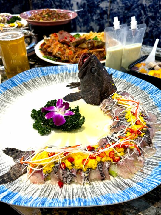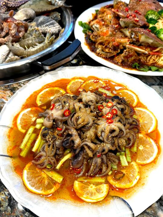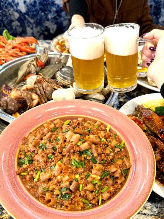 🤞🤞来日照旅游,不知道吃啥海鲜?👍听我的,闭眼冲嗨鲜·十二道菜,保准不踩雷!👊👊 🌹他们家清蒸石斑鱼端上桌,鱼鲜味直往鼻子里钻,肉嫩得像豆腐👍 🌹香蟹拌面更是一绝,螃蟹的鲜汁全裹在面条上,嗦一口超入味💥🌟。 🌹还有捞汁八爪鱼,吃起来又脆又鲜🎉 🌹海肠捞饭料超足,香得我能炫两大碗🎉。 🌟🌟店就在商场里,价格很实在,性价比超高。👏👏不管是游客,还是咱本地人,来这吃都倍儿合适!👍👍👏