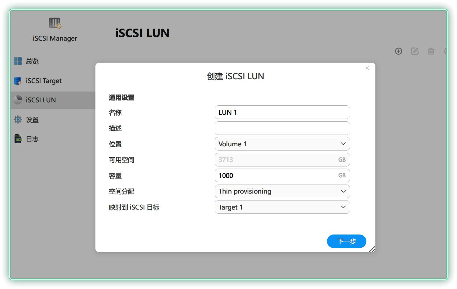 ▼接下来设置 iSCSI LUN,主要是分配硬盘空间,我这里分配了 1T 。