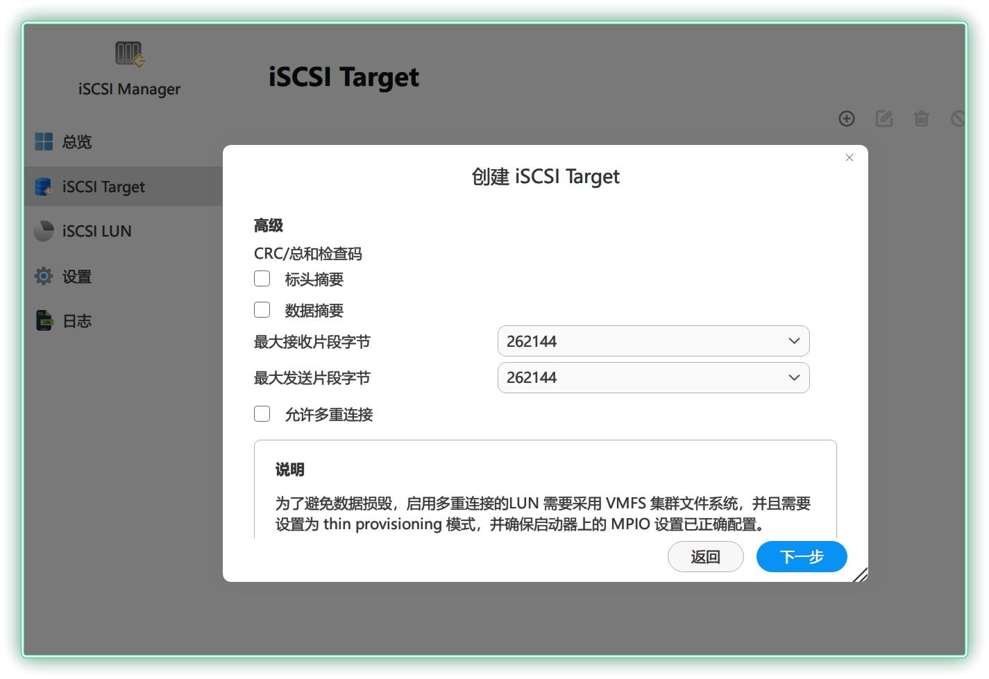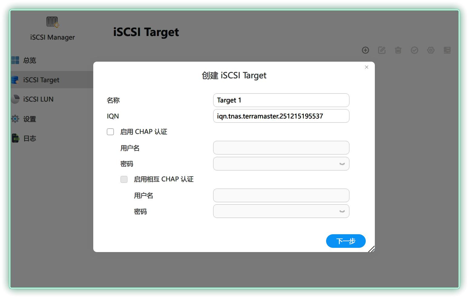 ▼创建 iSCSI Target,如果需要外网访问可以启用下面的 CHAP 认证,我基本只在局域网使用,所以下面没有设置。