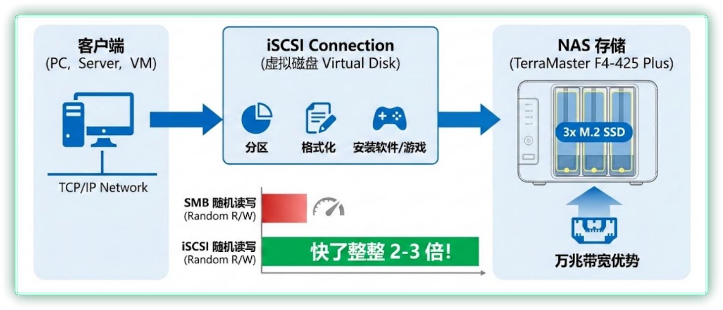 最重要的的是, iSCSI 挂载的随机读写速度比 SMB 快了整整 2-3 倍,配合铁威马 F4-425 Plus 的 3 条 M.2 SSD 更能体现万兆带宽的优势。