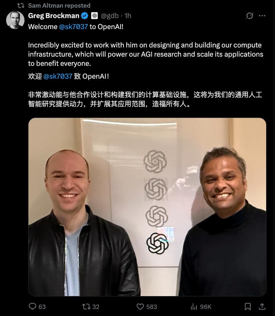 OpenAI 总裁 Greg Brockman 率先在 X 平台释出喜讯,明确 Katti 的新职责是设计和构建计算基础设施。这一安排精准契合 OpenAI 的核心诉求 —— 算力是 AGI 研发的关键瓶颈,也是其规模化应用的基础。