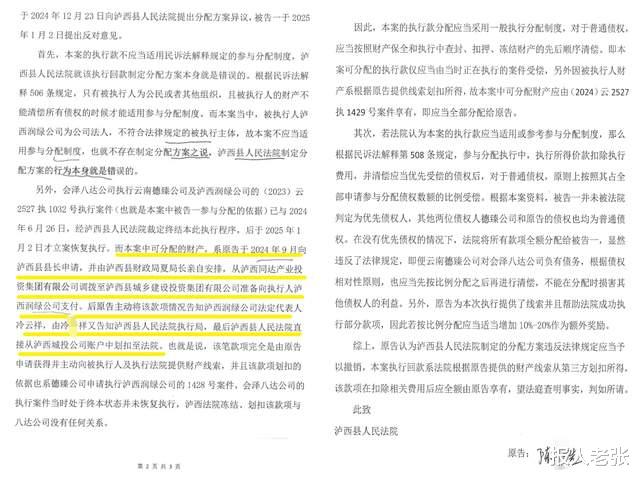 2024年12月9日,泸西县法院作出了一份《关于涉泸西润绿林业投资开发有限公司三案的案件款分配方案》(下称“三案分配方案”)。该方案中,法院认定润绿公司在欠付德臻公司77169271.39元的工程价款范围内对八达公司承担清偿责任,这也成了八达公司及上千农民工劳务费能否得到顺利执行的关键。