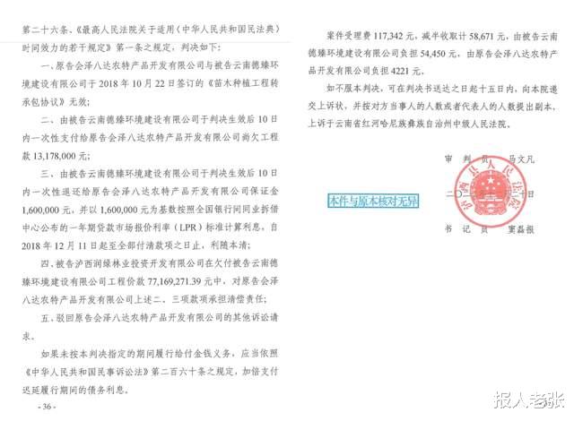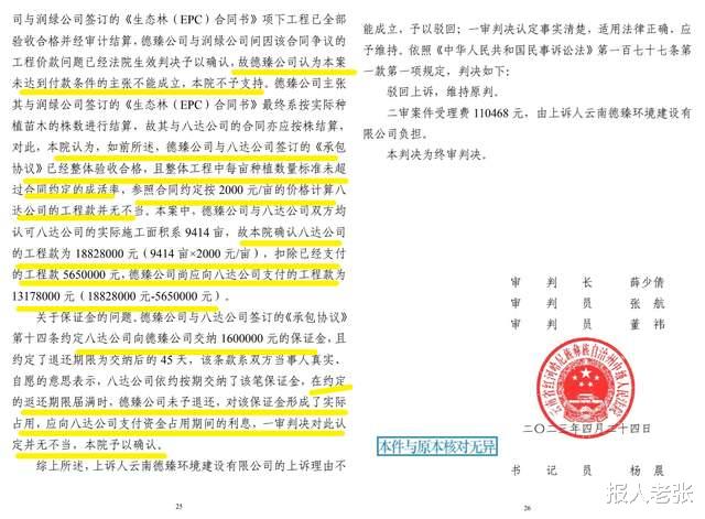 对此,八达公司的负责人表达了自己的担忧:“按照润绿公司的还款方案,2025年12月还有一笔700万元的款项到账,如果地方财政和润绿公司继续以欠款、还债的手法,以委托支付将这笔款项划走,自己将无法面对7年前就参与植树造林工程的1500多名农民工,如果不是这些纯朴的老百姓和父老乡亲心地善良,自己早就被起诉数百次,早就四处躲债无脸见人了。”