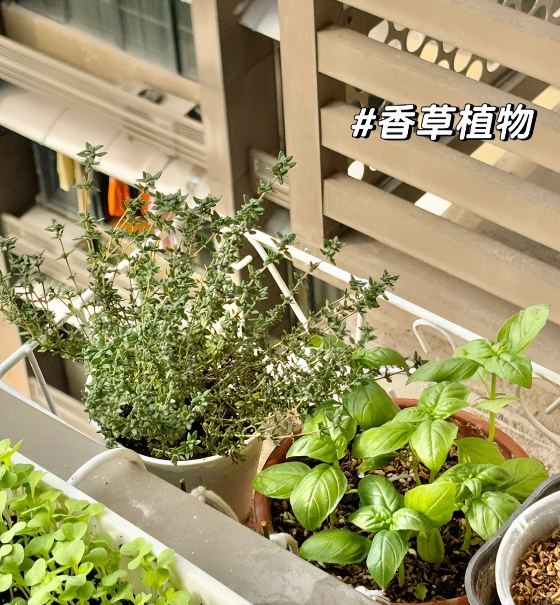 除了日常吃的青菜之外,像是常用的百里香、罗勒、迷迭香和薄荷,平时做个饮料啊、煎牛排、做意面都能用上。