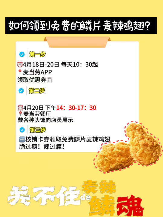 每个月初我都会喊着: X月...请对我好一点[捂嘴笑R][捂嘴笑R][捂嘴笑R] 没想到 麦麦真的听到了我的呼唤 四月真的对我这个麦麦忠粉如此友好! 不光是想念已久的 手工裹粉麦辣家族全面回归! (久违的裹粉麦辣鸡翅 我又可以狠狠爱一辈子了![红色心形R][红色心形R][红色心形R]) 而且还有先领券 后戴头饰 去麦当劳就可以免费吃 1对鳞片麦辣鸡翅活动! 真的是双喜临门了谁懂![心心眼R] 免费吃麦辣鸡翅活动具体攻略如下[黄金薯R]: ①先领券 4.18-4.20 每天10:30放领券 注意:券每日定时限量发布 发完即止 还有半价麦旋风和15r的麦辣鸡腿堡+ 雪碧套餐优惠券可以领! 宝宝们一定提前定好闹钟!!!⏰ ②再核销: 4.20日下午14:30-17:30 带任意有趣的头饰到店核销! 就可以领到免费的鳞片麦辣鸡翅啦![亲一个R] Ps: E人宝宝可以戴比较张扬的头饰 拍照更出片!全场你最靓! I人宝宝戴上头饰就不用担心拍照尴尬啦! 没人知道你是谁! 欢迎大家评论区返图! 看谁的头饰更fashion更有趣!