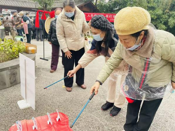 "锤丸之乐,古韵新潮"则是对传统体育项目的现代演绎。居民们在初次尝试中屡屡失败,但在工作人员的指导下逐渐掌握技巧,击丸入门的成就感让他们欢呼雀跃。这一项目不仅让居民体验到古代运动的乐趣,更在互动中传播了中华传统体育文化。