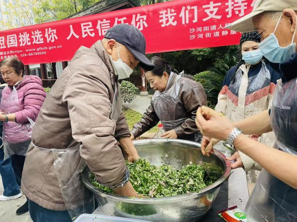 最令人期待的是包饺子环节。叔叔阿姨们围坐在长桌旁,包饺子的手法各具特色:有的"元宝饺"折褶细密、造型饱满;有的"柳叶饺"花边精巧、灵秀美观;也有的甚至"露了馅",但现场洋溢着的欢声笑语,让每个人都沉浸在浓浓的节日氛围和邻里温情之中。值得一提的是,静康社区刘书记也早早来到活动现场,洗净双手,加入包饺子队伍,刘书记与居民们边包边聊,从家常琐事到社区建设,亲切的话语间拉近了党群距离,将整个活动推向了情感交流的高潮。