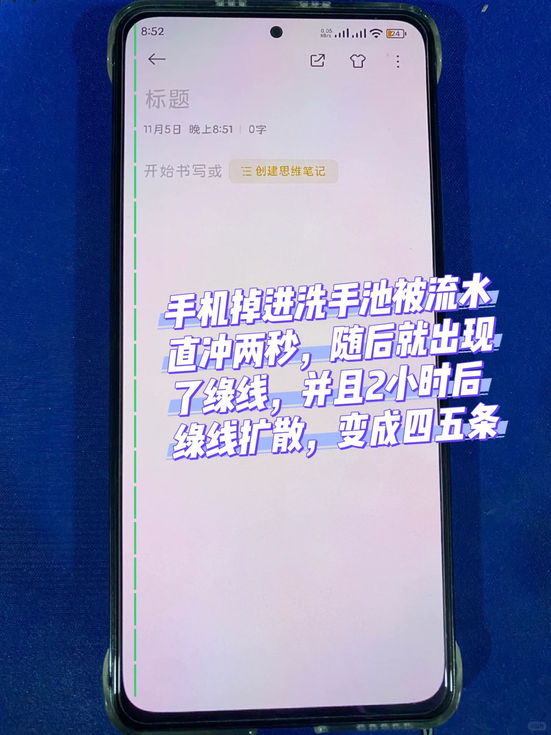 手机要是掉进了洗手池里面,被流水冲了两秒钟,迅速拿出来,你会发现屏幕依然受损了,出了一条绿线,两个小时之后,绿线开始扩散,变成了四五条,该怎么办?