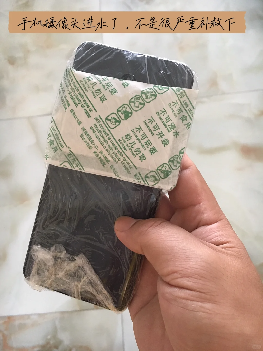 其实可以自救的,就用零食袋中的干燥剂,可以拯救失足的手机,只要将零食袋中的干燥剂放在手机摄像头上面,然后使用保鲜膜包裹起来。