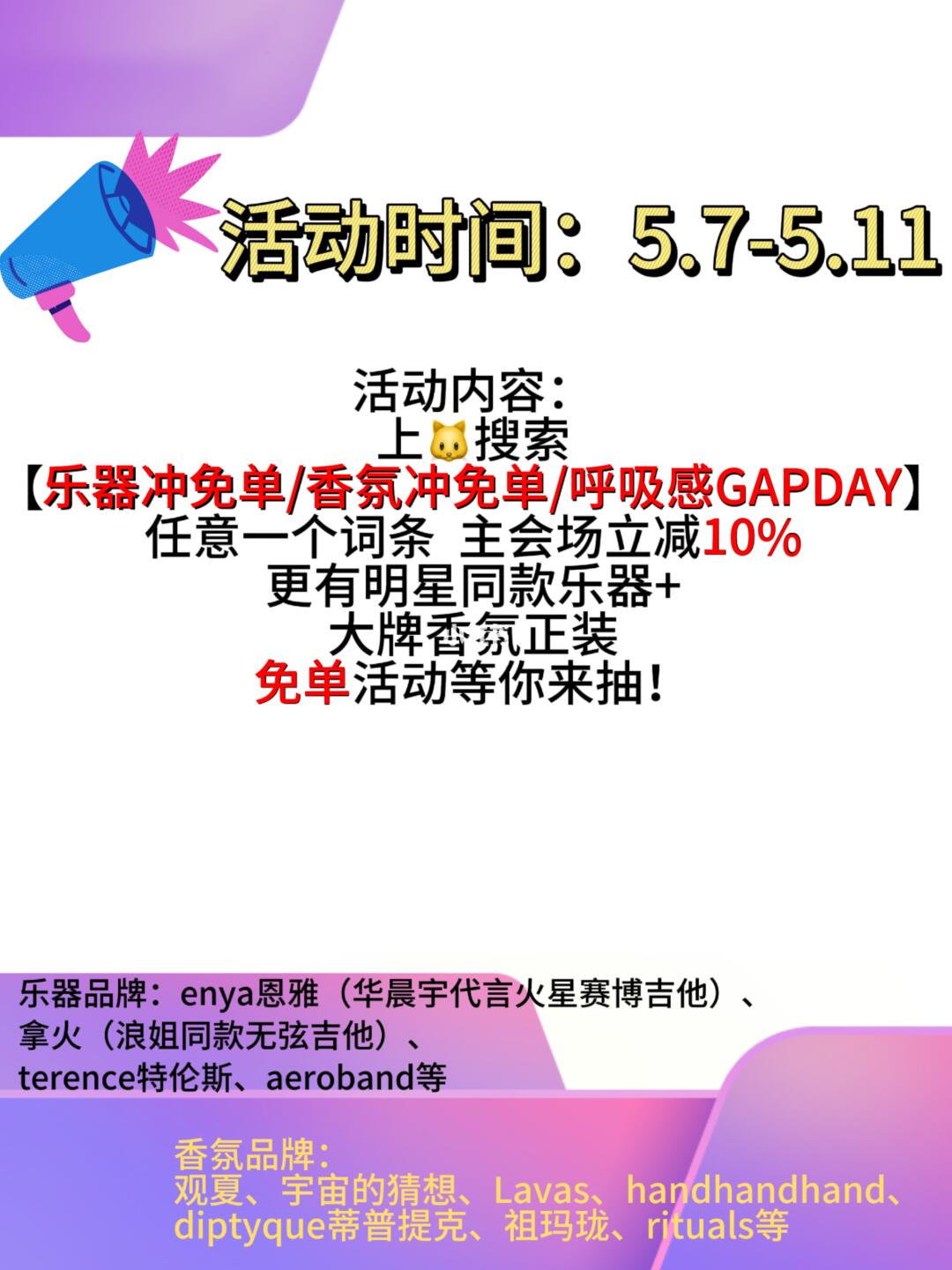 妈妈今天给我分享了一个消息: 她要有华晨宇同款恩雅吉他了🎸 我:哪里来的 我妈:有免单活动 我:哈?那么贵的吉他 有人免费送你?你莫不是遭骗了? 追星女晚上睡不着的幻想罢了[捂嘴笑R][捂嘴笑R][捂嘴笑R] 我妈:火姐不骗火姐!🔥 她有内幕消息: 5月7日-11号 🐱每天都有明星同款吉他+大牌香氛正装免单 吉他品牌有enya恩雅(华晨宇代言)、拿火(浪姐同款)、terence等 香薰品牌有观夏、宇宙的猜想、Lavas等 我:嚯!都是大牌子!得不少钱 我妈:这不🐱心眼好 搞了个呼吸感GAP DAY 让你们年轻人松快一下 现在孩子太累了 想想下班回来 点一个免单香薰 弹一下免单吉他 是不是觉得生活有盼头多了[赞R] 我:一想都是免单 不花我的钱 简直神清气爽! 天灵灵 地灵灵 这次中我行不行[心心眼R] 我妈:上阵母女兵 你中香薰 我中恩雅吉他!