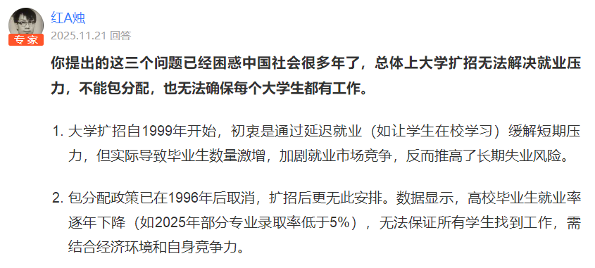 顶层设计未建立 “主动分流就业压力” 与 “持续创造优质岗位” 的有效机制,依赖 “扩招延毕” 短期缓冲,导致矛盾不断累积。