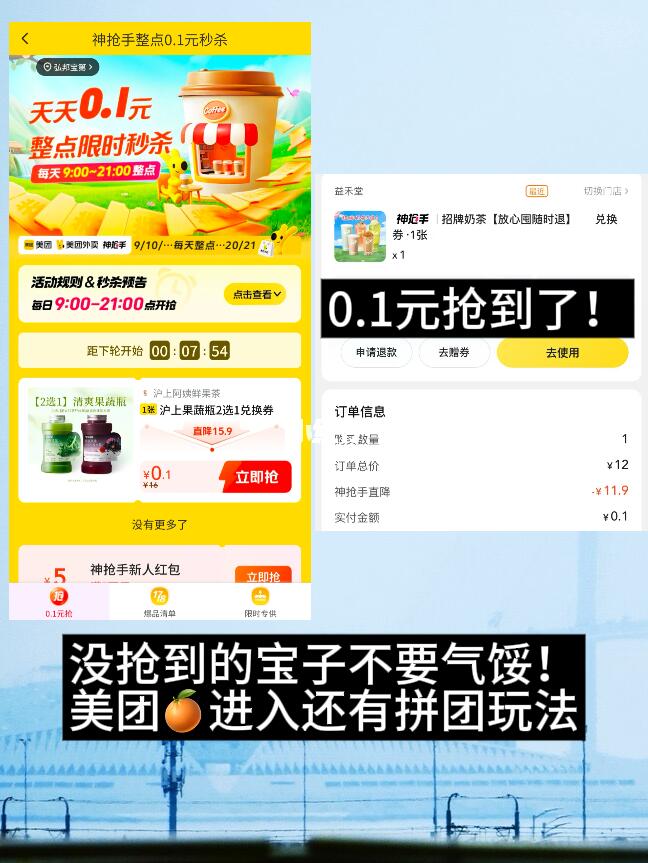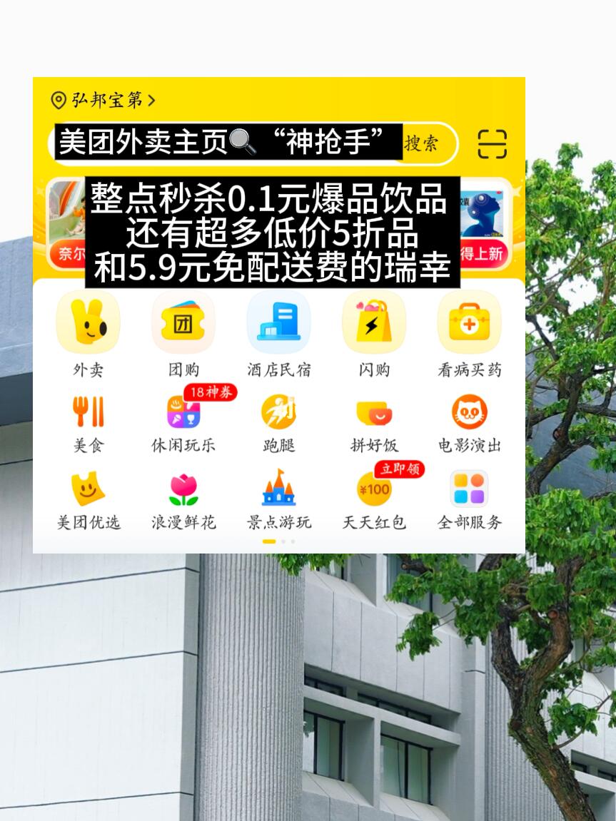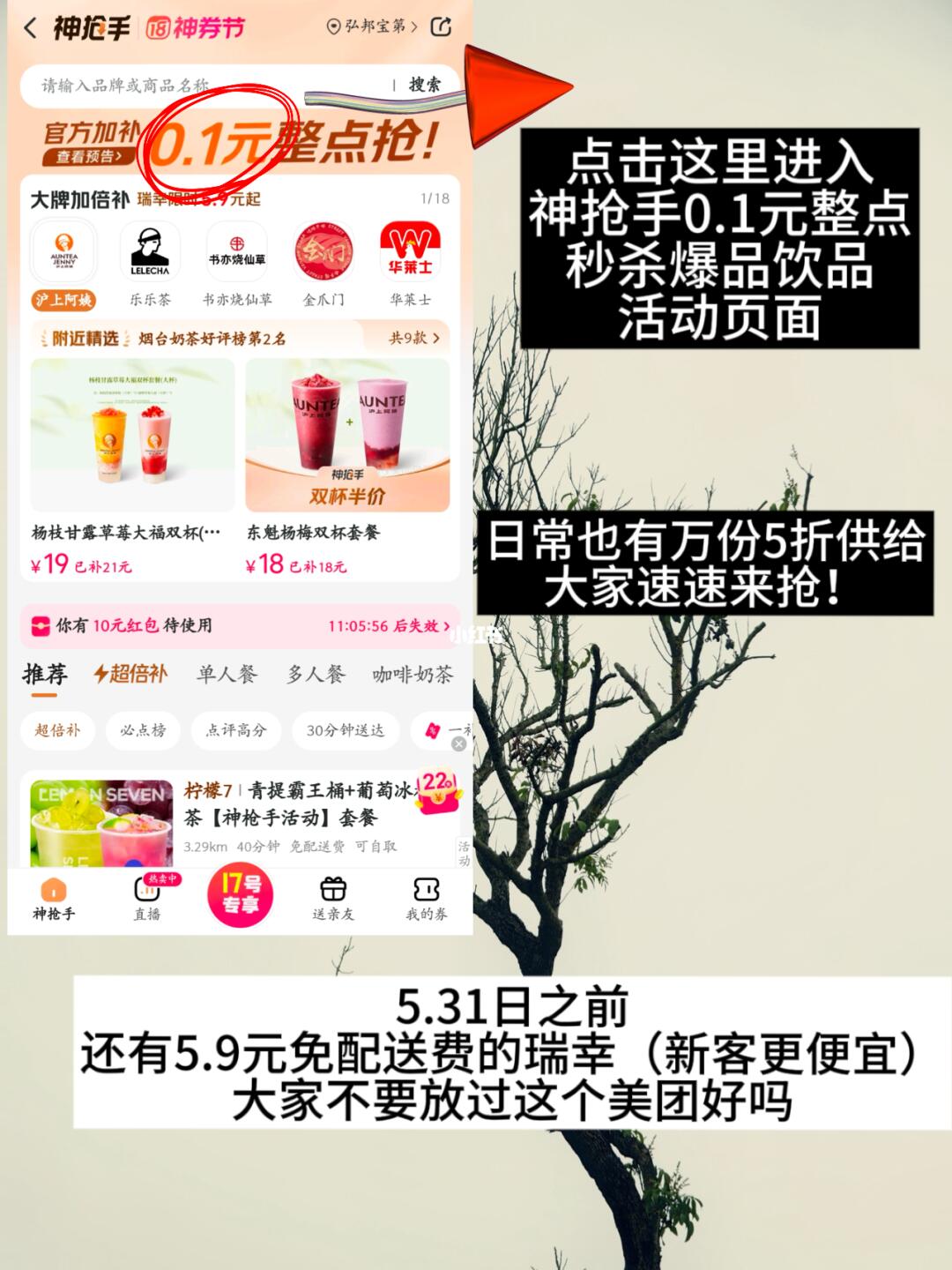 已经戒了奶茶的我 这次外卖商战又复喝起来了...[捂嘴笑R][捂嘴笑R][捂嘴笑R] 商战让我变了一个人 以前的我: 十几块钱的奶茶 好便宜![大笑R] 现在的钮祜禄.Q: 超过8元的奶茶看都不看[微笑R] 少于1元的奶茶我大喝特喝... 谁懂 家里的冰箱已经放满了奶茶🧋 奶茶袋子也已经攒了一大堆 每天不点一杯个位数的奶茶 就觉得没占到便宜... 减肥的事更是被我抛之脑后[生气R] 毕竟减肥是要努力一辈子的事 但0.1元的奶茶和5.9元免配送费的瑞幸 这时候不喝 下次恐怕很难遇到了[钱袋R] 跟我一样 想要超划算价格喝到奶茶的朋友 记得上美团主页搜【神抢手】 点击神抢手主页顶部的0.1活动 (不明白的左滑查看图示教程)[向右R] 就可以进入活动页面: 开始0.1元整点秒杀爆品饮品! 日常也有很多五折低价品! 茶百道、爷爷不泡茶、林里、古茗、瑞幸等火爆品牌都参与其中! (0.1元买不了吃亏 买不了上当 但可以买到1杯小甜水[耶R]) 5.9元还能喝到免配送费的瑞幸咖啡 (新客更便宜) 大家快冲![合十R] 如果每个人都因为外卖商战胖2斤 那就相当于我没胖...