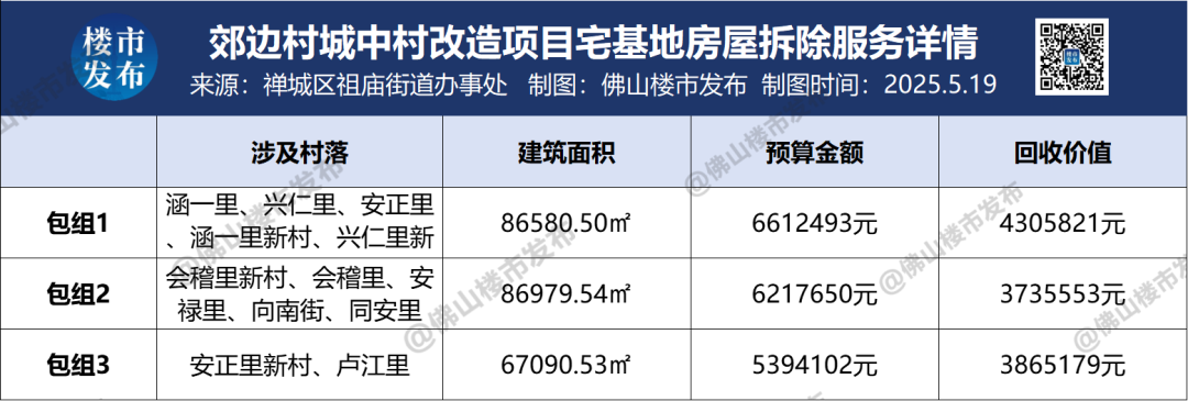 公告指出,郊边村城中村改造项目分为三个包组,针对不同村落提供宅基地房屋拆除服务,合计预算金额1822.424万元。