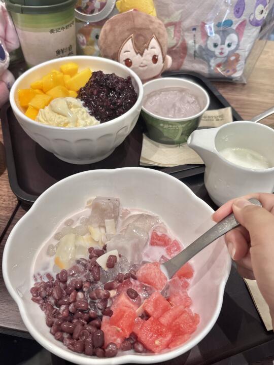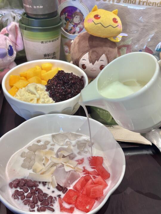 这个料真的很多!超大西瓜🍉块➕绵密的红豆🫘➕超糯Q弹的小丸子还有椰香十足的椰子片!再把鲜奶倒进去搅拌均匀,口感真的是 特别丰富!一口就爱上了👋🏻