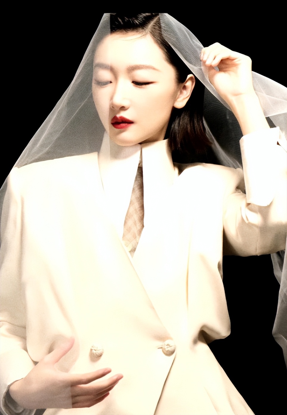 在这次的活动中,周冬雨选择了一件设计感十足的米白色西装作为单品。