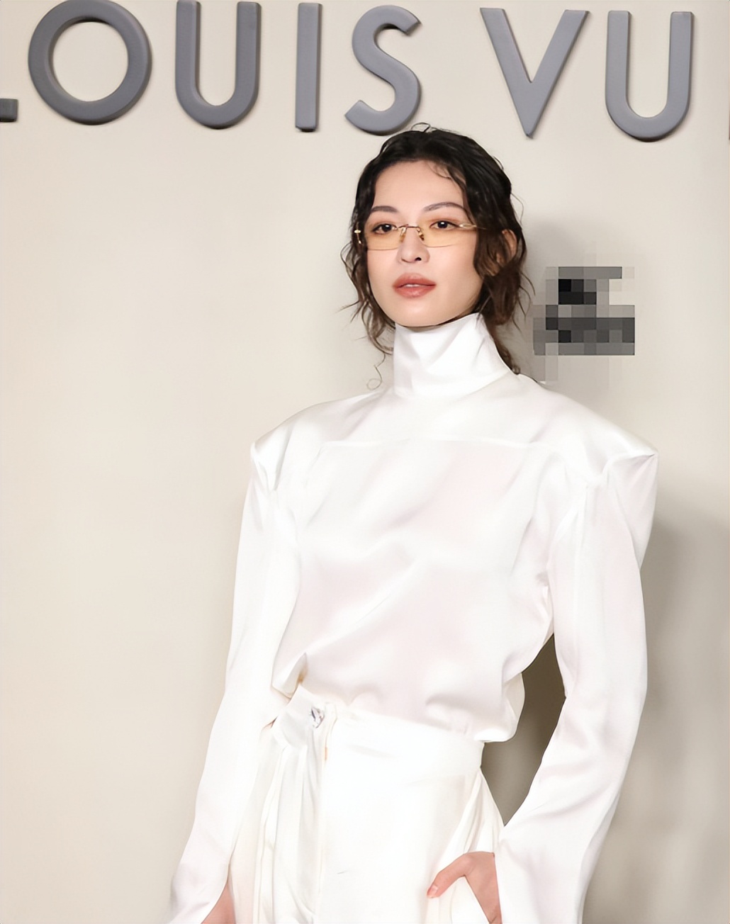 高领绸缎上衣搭配同色系的裤子,显得十分松弛,而无框眼镜则十分亮眼,增加了钟楚曦的清冷感。