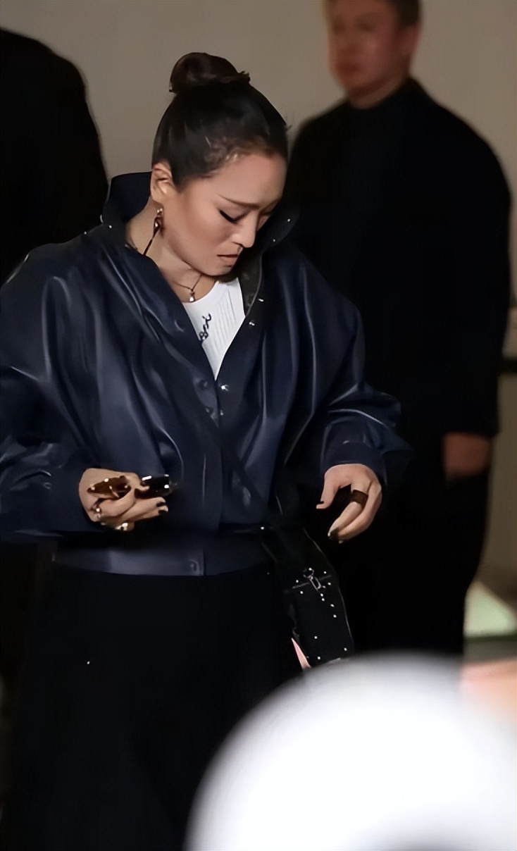 本次造型,她选择了一身简单的深蓝色皮夹克,搭配了一条黑色的短裙。