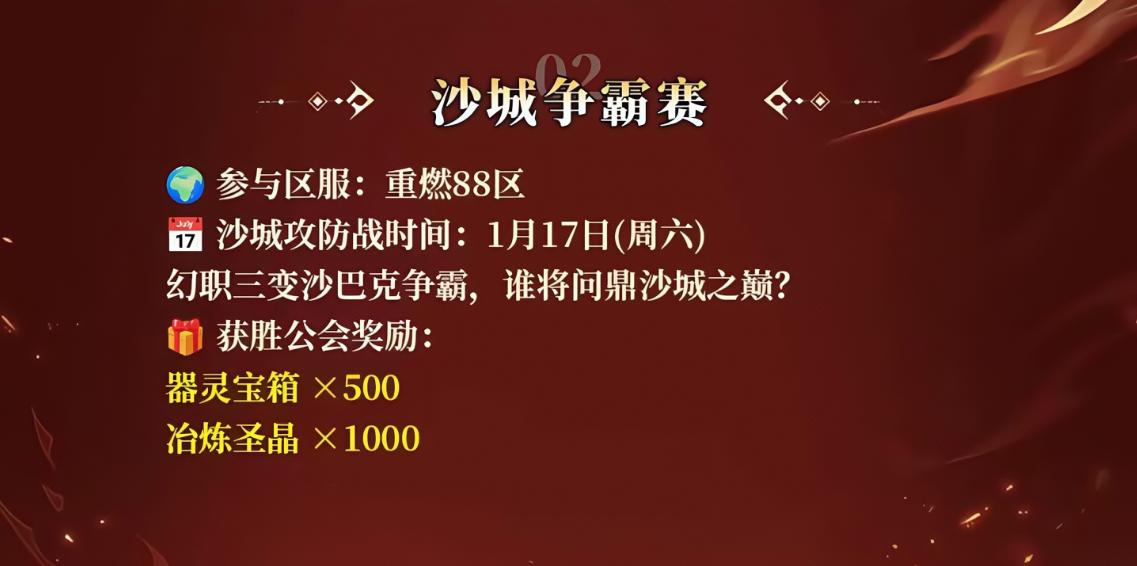 1月17日(周六)将开启沙城攻防战,幻职三变沙巴克争霸赛燃情开战。获胜公会可获得器灵宝箱×500、冶炼圣晶×1000的丰厚奖励,无论是个人参与还是公会协作,都能在赛事中收获大量资源,为搬砖之路锦上添花。