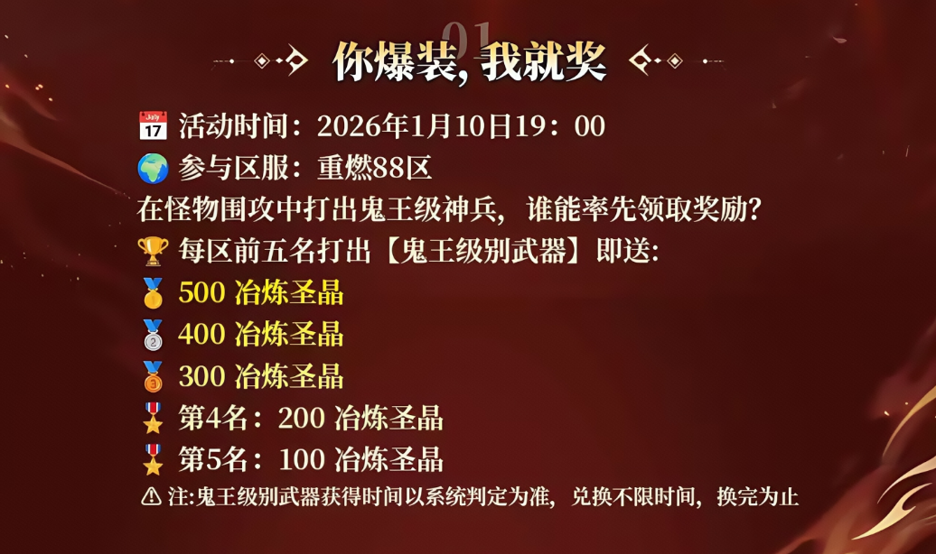 活动时间为2026年1月10日19:00,仅限重燃88区参与。在怪物围攻中打出鬼王级神兵,每区前五名打出【鬼王级别武器】的玩家,可获得数量不等的冶炼圣晶:第一名500个、第二名400个、第三名300个、第四名200个、第五名100个。冶炼圣晶作为游戏内重要资源,能为装备打造、养成提供关键助力,是搬砖积累的优质素材。