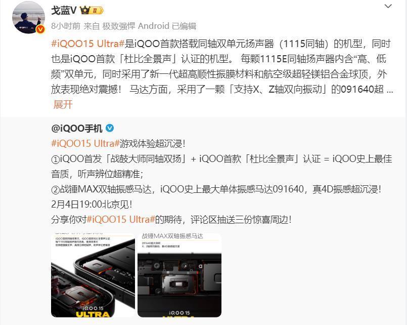 随后, @戈蓝V 再次转发了该条官博,并补充称,“#iQOO15 Ultra#是iQOO首款搭载同轴双单元扬声器(1115同轴)的机型,同时也是iQOO首款「杜比全景声」认证的机型。 每颗1115E同轴扬声器内含‘高、低频’双单元,同时采用了新一代超高顺性振膜材料和航空级超轻镁铝合金球顶,外放表现绝对震撼! 马达方面,采用了一颗「支持X、Z轴双向振动」的091640超大体积马达,这里有个小知识:不是所有的0916马达,都能双向振动。”同时,其还确认,“这颗战锤马达最开始就是为#iQOO15 Ultra# 单独开发定制的,体积大振动好,行业首个X/Z双轴线性马达,好东西的代价就是有点贵。”