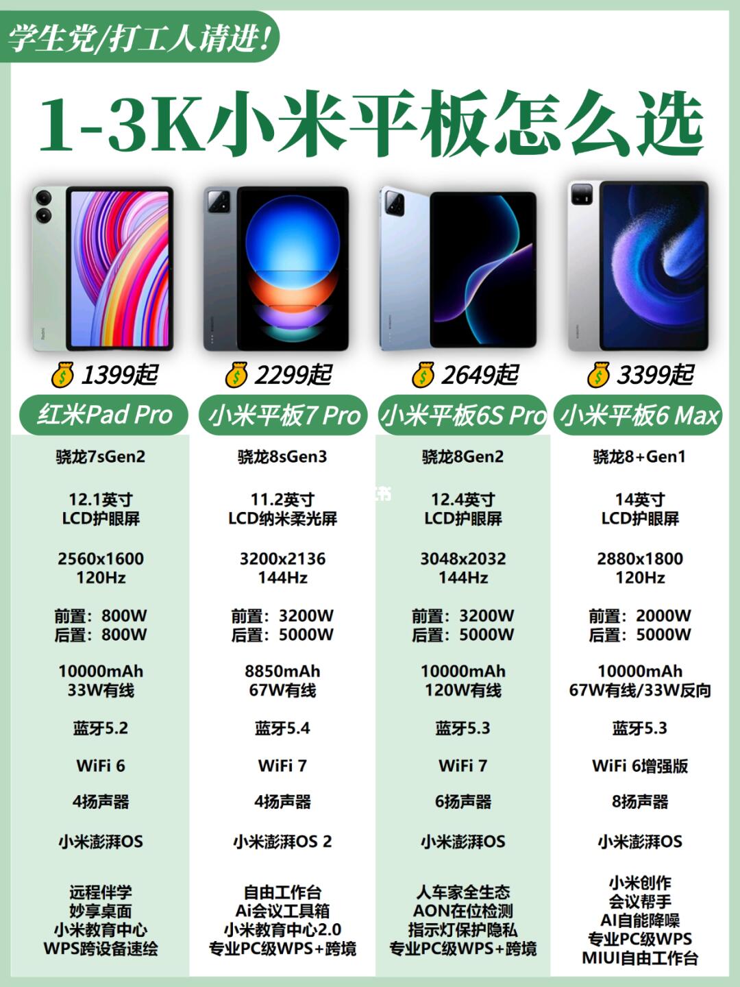 – 嗨~姐妹!1-3K预算买小米平板?看这篇就够了! 学生党省钱首选👉 红米Pad Pro 12.1寸大屏+超长续航,网课追剧不伤眼,1000多块搞定! 性能党闭眼入👉 小米平板7Pro 骁龙8s Gen3+144Hz高刷,游戏办公都流畅,2000多块性价比炸裂! 大屏办公选它👉 小米6S Pro 12.4寸3K屏+120W快充,多窗口办公超方便,适合写论文、做表格的打工人! 影音狂魔必买👉 小米平板6Max 14寸巨屏+八扬声器,看剧爽到飞起,还能当轻办公副屏! 💡简单总结: 便宜实用→红米Pad Pro 打游戏/高性能→7Pro 办公学习→6S Pro 追剧大屏→6Max – 纠结买哪款?评论区告诉我你的需求,直接给你答案! 😎