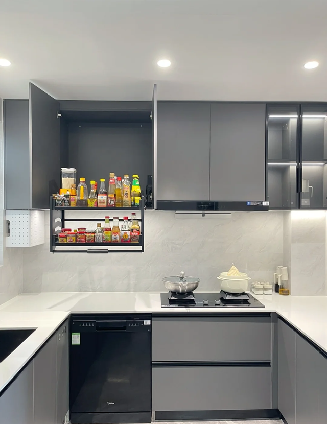 每次拿取时,非常的方便,只需要轻轻的一拉,就能让吊柜中的拉篮到合理的高度,收纳时,关上柜子也看不出来,真的是超级方便,又实用的装修设计!