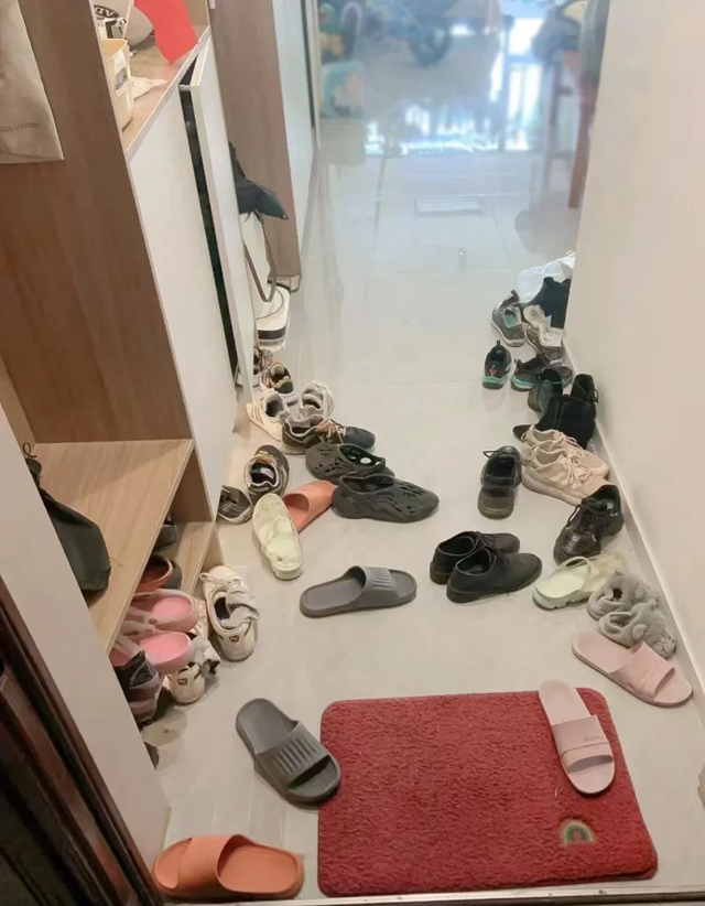 每次看着这样的乱糟糟的玄关处,就非常的头疼,建议各位小伙伴在装修玄关柜时,一定要记得,留两层开放格,一层放拖鞋,一层放外面的鞋子,干净又卫生。