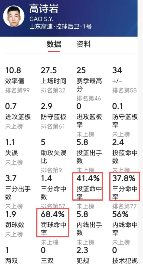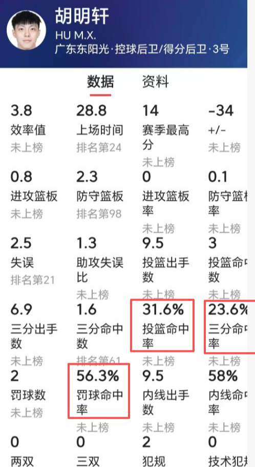 现在网络上流传一句话:广东队也有一个“高铁”,甚至比山东高铁还离谱。不说不知道,一查吓一跳。经过查看数据,胡明轩本赛季真的是比山东高铁还离谱。高诗岩的三项命中率是41%、37%、68%,而胡明轩是31%、23.6%、56.3%,投篮命中率、三分命中率和罚球命中率都比山东高铁低。你难以想象,顶薪球员和队长的罚命中率不到6成,三分命中率只是2成多。胡明轩本赛季真是中了邪了。