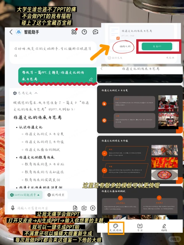 ✅AI生成PPT:百度文库里面还阔以AI生成PPT喔,生成的PPT结构清晰,内容丰富,版式美观,不怎么会做PPT的有福啦,可以很好地学习以及借鉴一下它是咋做PPT滴里面还有敲多的模板可以更换。