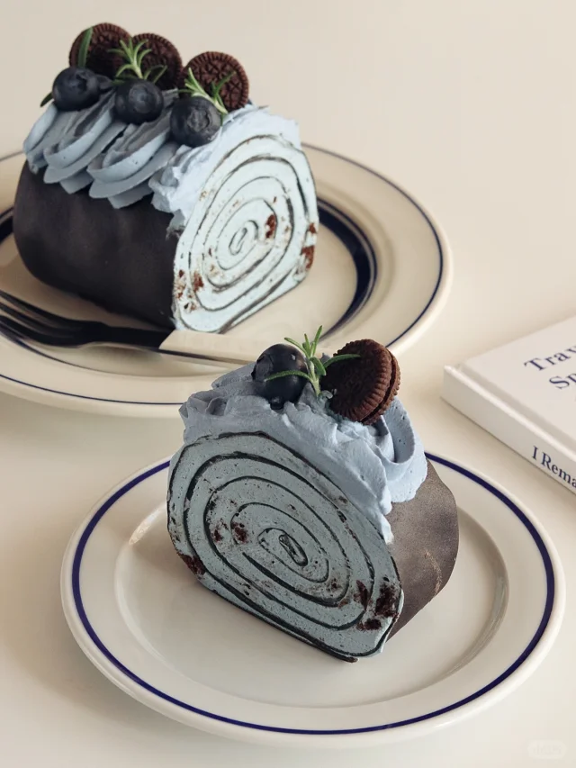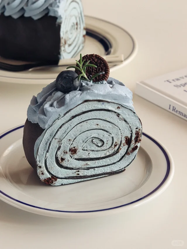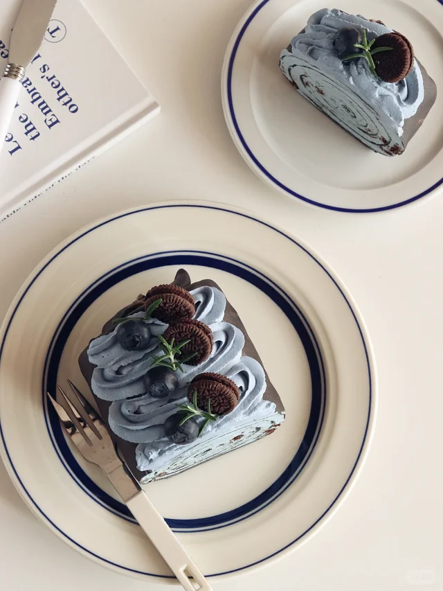 ❼装饰用奶油食材混合打发后挤在蛋糕上,再用蓝莓和饼干装饰即可