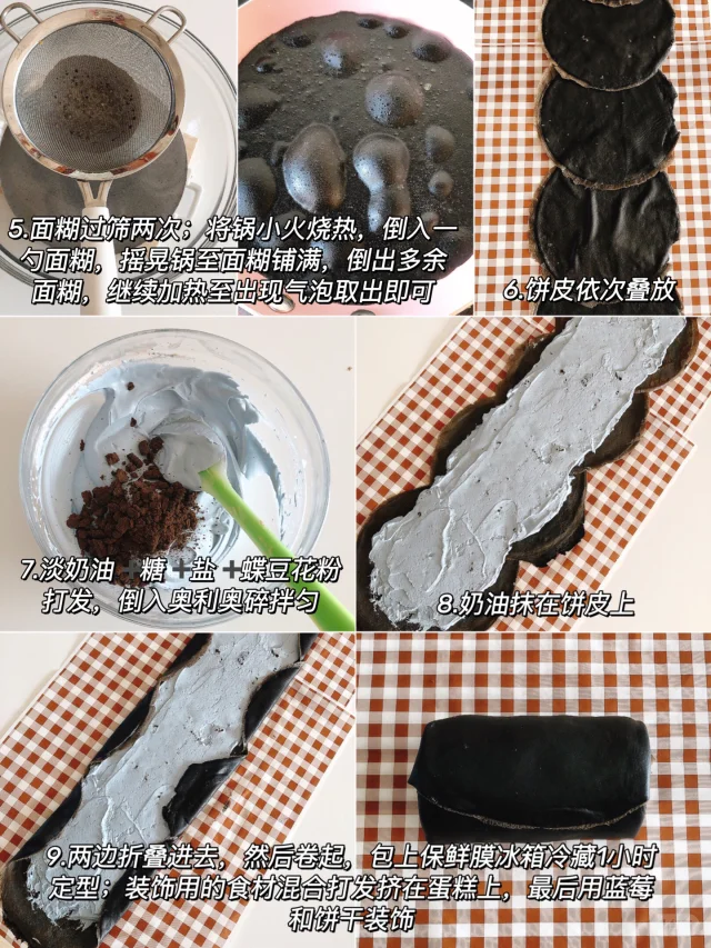❻将打发的奶油抹在饼皮上,两边叠进去然后卷起,包保鲜膜入冰箱冷藏1小时定型