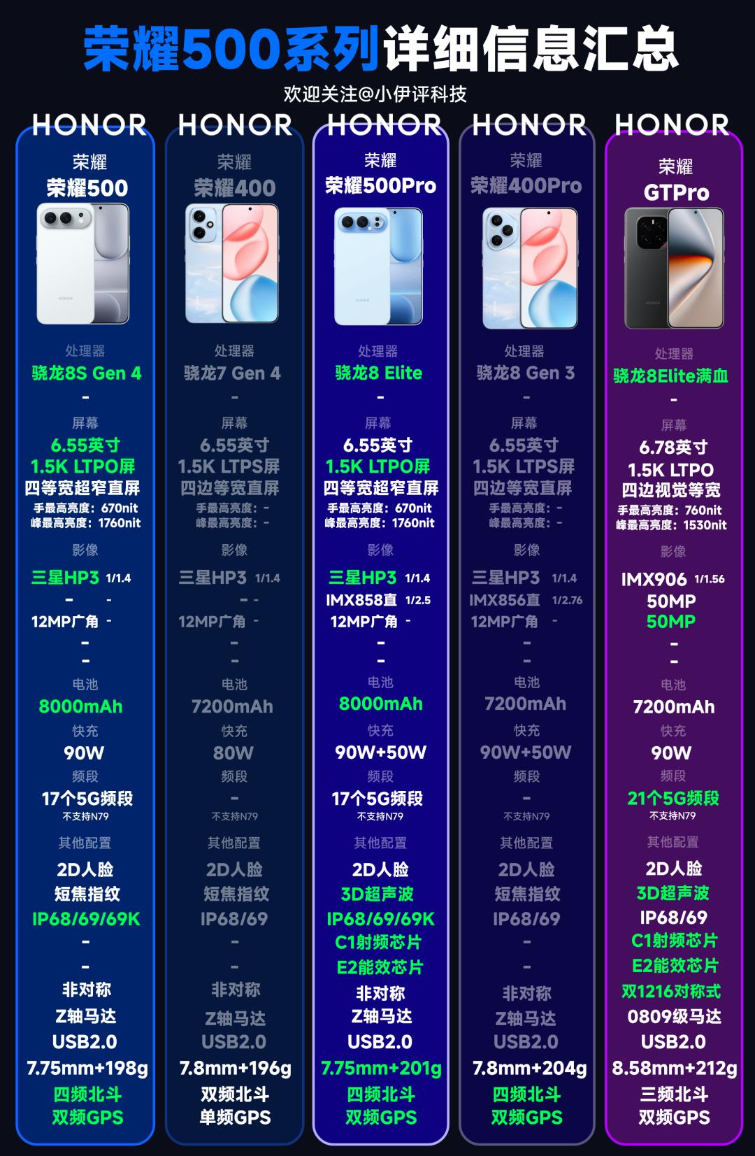 接下来还是一图流,给大家详细的汇总一下荣耀500系列的配置情况,如下所示,对比机型是荣耀400系列以及荣耀一代神机荣耀GTPro。