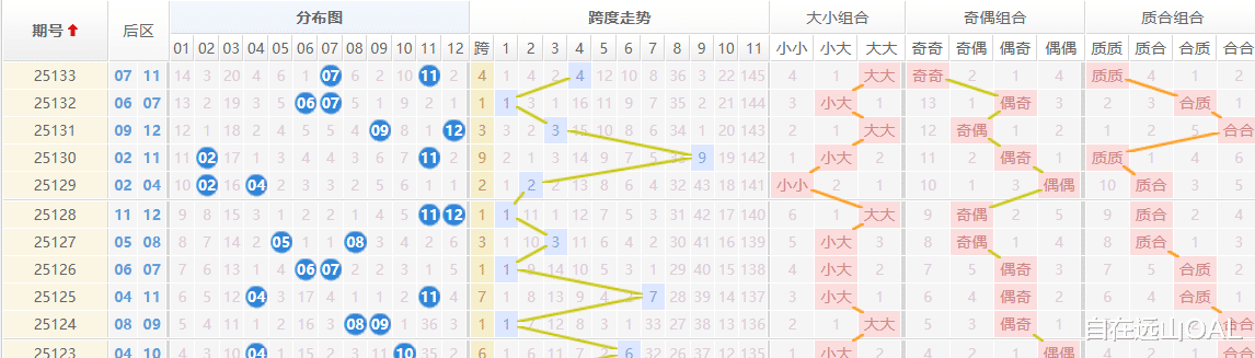 后区方面,全奇、全偶组合交替出现,下期可侧重全偶。小大组合上,近期小大组合(如07-11)占优,下期可关注双大组合或一小一大。