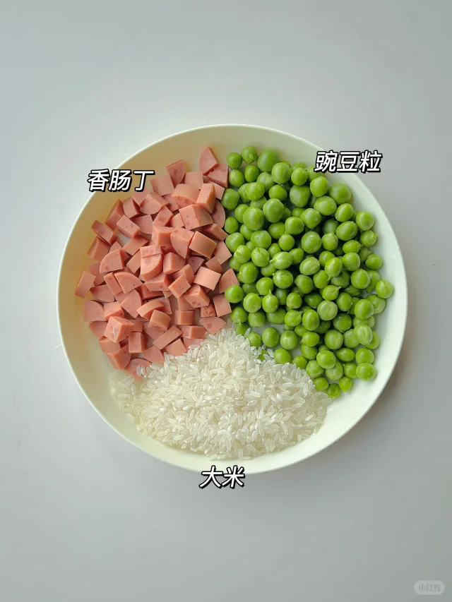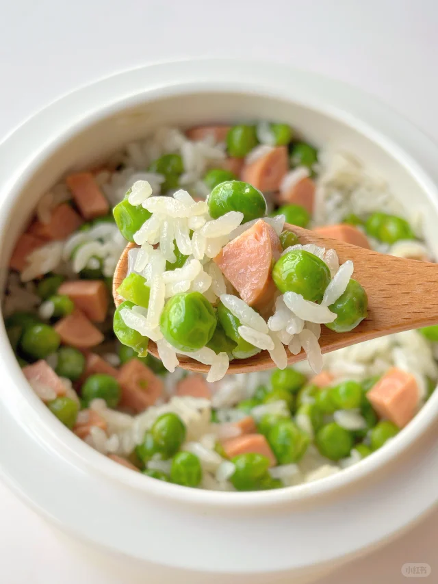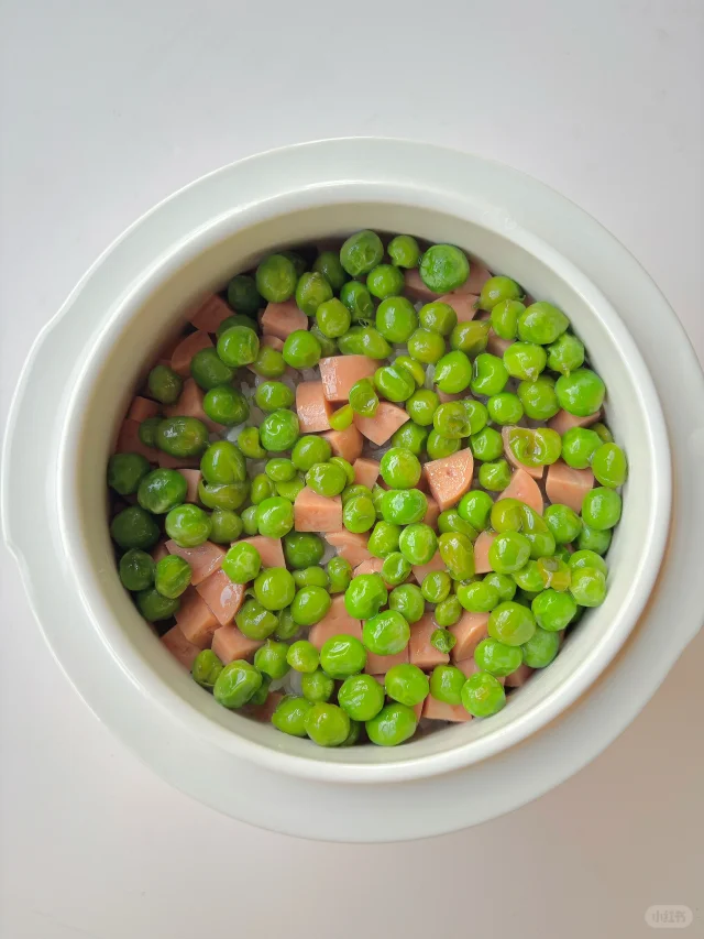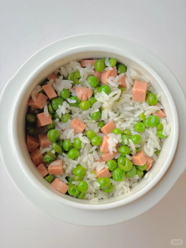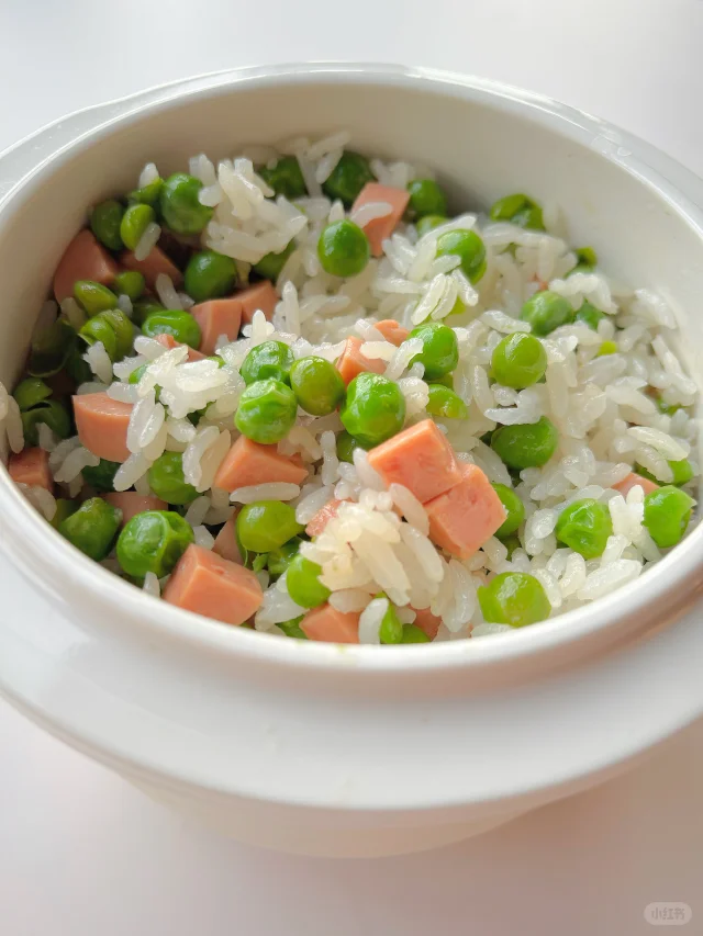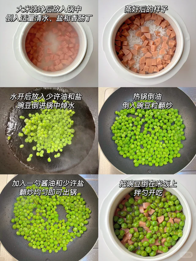 🌈春季正是吃豌豆的时候~今天做的豌豆饭鲜甜清香,调味简单但油润入味,放心安排,爱吃豌豆的小朋友肯定喜欢~ 🎈准备食材: 1️⃣豌豆粒150克、香肠丁70克和大米适量; 🎈制作步骤: 1️⃣大米洗净后放入锅中,倒入适量清水、盐和香肠丁,米饭模式煮熟; 2️⃣水开后放入少许油和盐,豌豆倒进锅中焯水; 3️⃣热锅倒油,倒入豌豆粒翻炒,加入一勺酱油和少许盐,翻炒均匀即可出锅; 把炒好的豌豆倒在米饭上拌匀开吃~