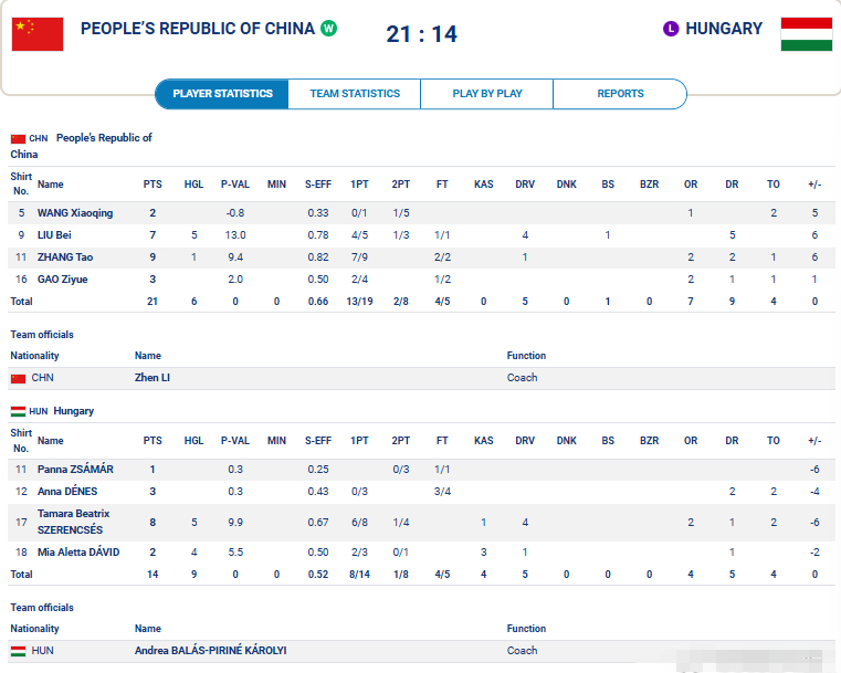 中国21-14匈牙利,张涛9分,刘贝7分5篮板。匈牙利塔玛拉-碧翠克斯-塞伦切什空砍8分。