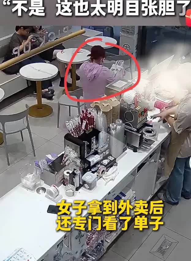 这也太明目张胆了吧! “外卖员”“进店”取外卖,女子推门而入,直奔柜台取外卖。店员在专心的做着饮品,以为是外卖员。女子拿到外卖后还专门看了单子。 当时店员正忙着摇奶茶,机器嗡嗡响,压根没抬头细看。柜台角落堆着三四个外卖袋,女子径直拿起最上面那个,手指在单子上划了两下,转身就走。 没过十分钟,真正的外卖小哥骑着电动车冲进来,满头是汗地问:“刚下的奶茶外卖呢?顾客催疯了。”店员这才懵了,赶紧去柜台找,哪还有影子。 调监控一看,所有人都气够呛。那女子穿着普通外套,走路带风,拿外卖时眼神直勾勾的,一点没心虚。看单子的动作,倒像是怕拿错了自己不喜欢的。 被偷的顾客很快打来电话,语气急得不行:“我等了四十分钟,告诉我外卖没了?你们怎么看的店!”店员连连道歉,只能重新做一份加急送过去。 老板赶来时,眉头皱成了疙瘩。前两次是趁我们忙,这次直接冒充外卖员。” 周围吃饭的客人也议论开了。有人说现在啥人都有,几块钱的东西也偷;有人替店员委屈,干着活还得防贼。外卖小哥在一旁跺脚,这单超时罚款得自己扛。 本是方便你我的买卖,咋就成了有些人占便宜的空子?