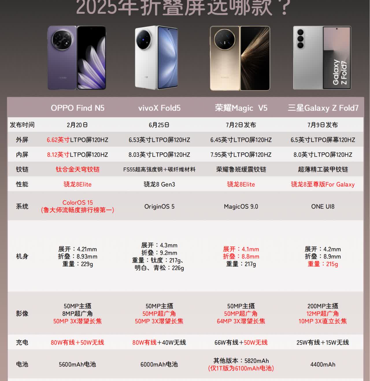 买三星大折叠的女粉估计要激增了!! 万万没想到,三星居然请了Henry(刘宪华)当三星Z Fold7的代言人!! 加上这代Z Fold7也做得很轻薄,握持手感非常接近直板旗舰, 应该会有挺多女粉想要get大华同款折叠屏吧? 不过,虽然Z Fold7产品力没得说,但价格对比国产大折叠还是要高不少的, 如果更看中性价比的话,荣耀Magic V5、vivo X Fold5、OPPO Find N5 这几款个人感觉还是要更有吸引力一些, 它们同样在轻薄上下足功夫。 特别是Find N5更是率先引领轻薄狂潮,轻薄和交互体验可以说领先了大半年, 其他品牌才陆续跟上。 另外,vivo这边提供有原子工作台,多任务交互更方便,就是骁龙 8 Gen3 处理器有点拖后腿。 而荣耀Magic V5和OPPO Find N5都是妥妥的均衡型选手,配置和体验都没啥可挑剔的,同时两者手感也差不多。有一点需要注意的是,荣耀的1TB版本才配备有6100mAh大电池。 说实话,要是不考虑预算,三星 Z Fold7确实吸引人,毕竟是明星同款,还是最早做折叠屏的厂商。 但如果要说 折叠手机哪款性价比高,质量好,那OPPO Find N5必须拥有姓名。第三方平台7K+的价格,钛合金铰链超耐用,骁龙8至尊版性能强劲,ColorOS 15系统流畅度拉满,体验全面又均衡,真的很难不爱!