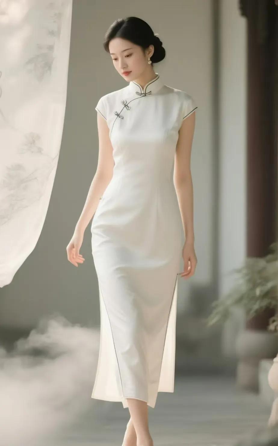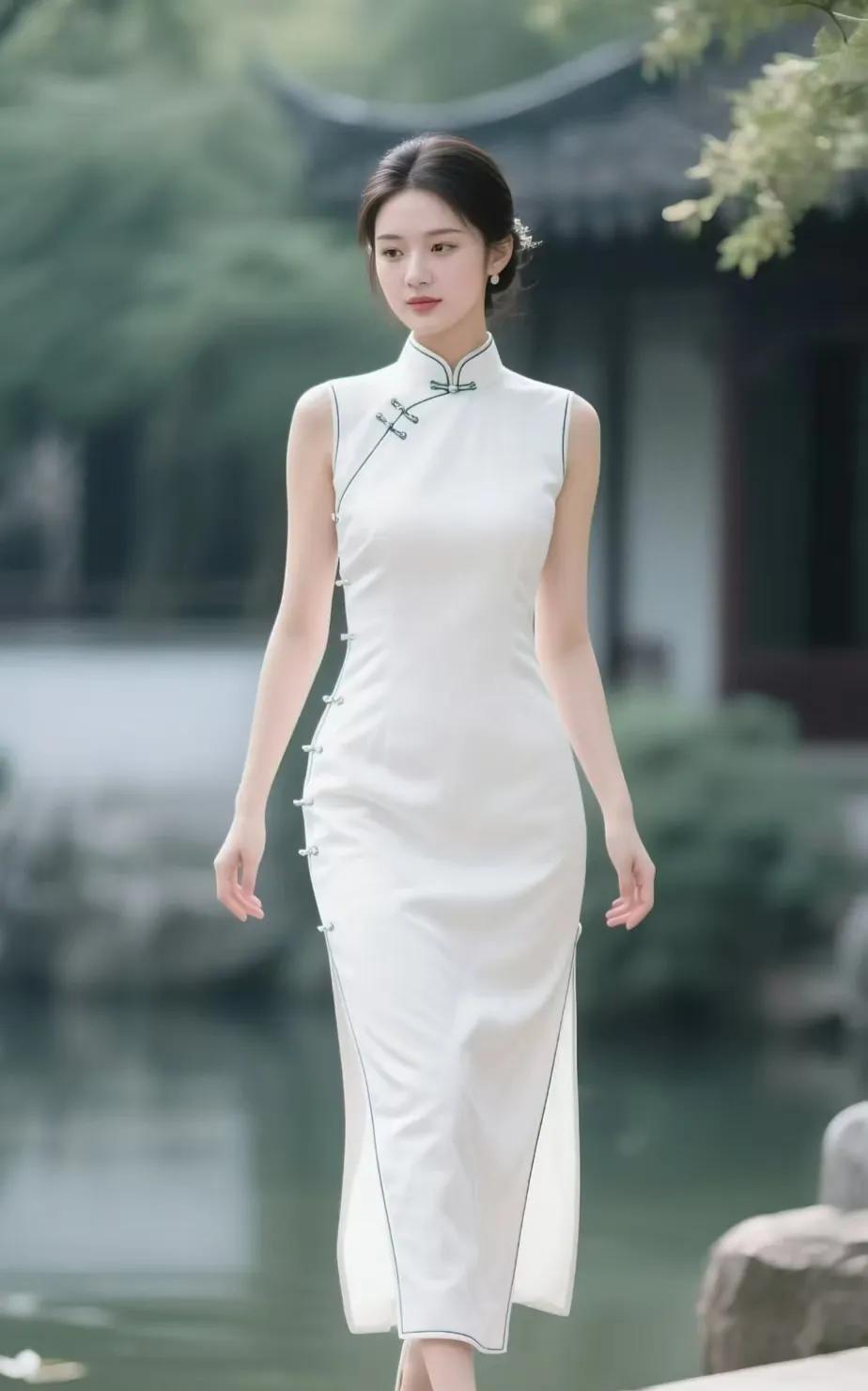 一袭白旗袍裹身,美女身姿窈窕,如云间仙子。眉眼含情,莲步轻移,尽显东方温婉与典雅