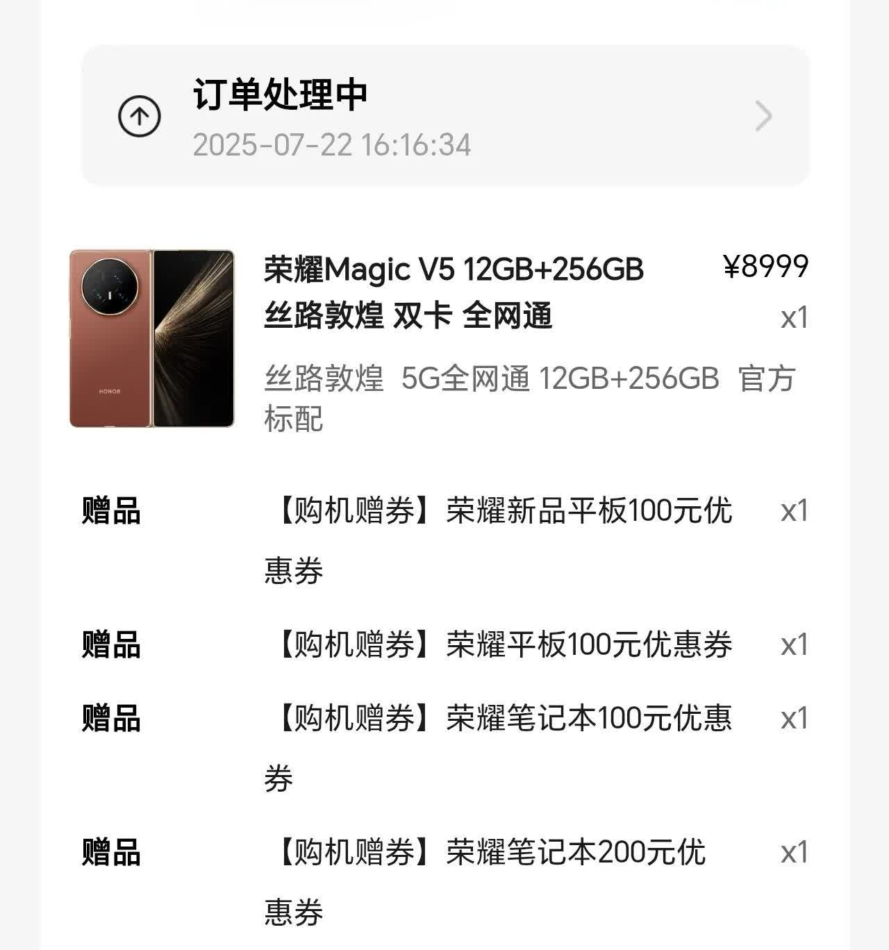 荣耀Magic V5的供货好像上来了,已经可以48小时发货了,果断直接下单一台。 这么轻薄的大折叠还是第一次见,现在限制折叠屏手机厚度的可能就是Type-C充电接口,无线充电功率已经够快了,未来会不会直接去掉有线充电接口[吐舌]