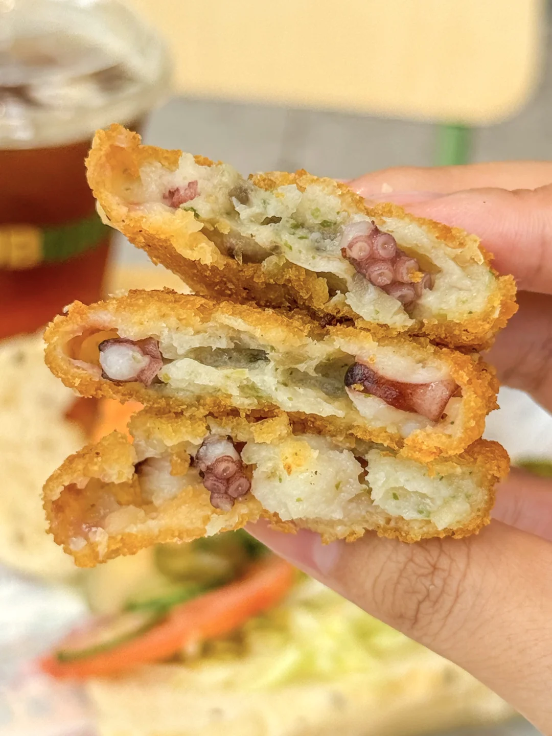🐙阳光小八章鱼饼一入口就是软糯鱼糜,再搭配Q弹的章鱼颗粒,口感层次贼丰富!