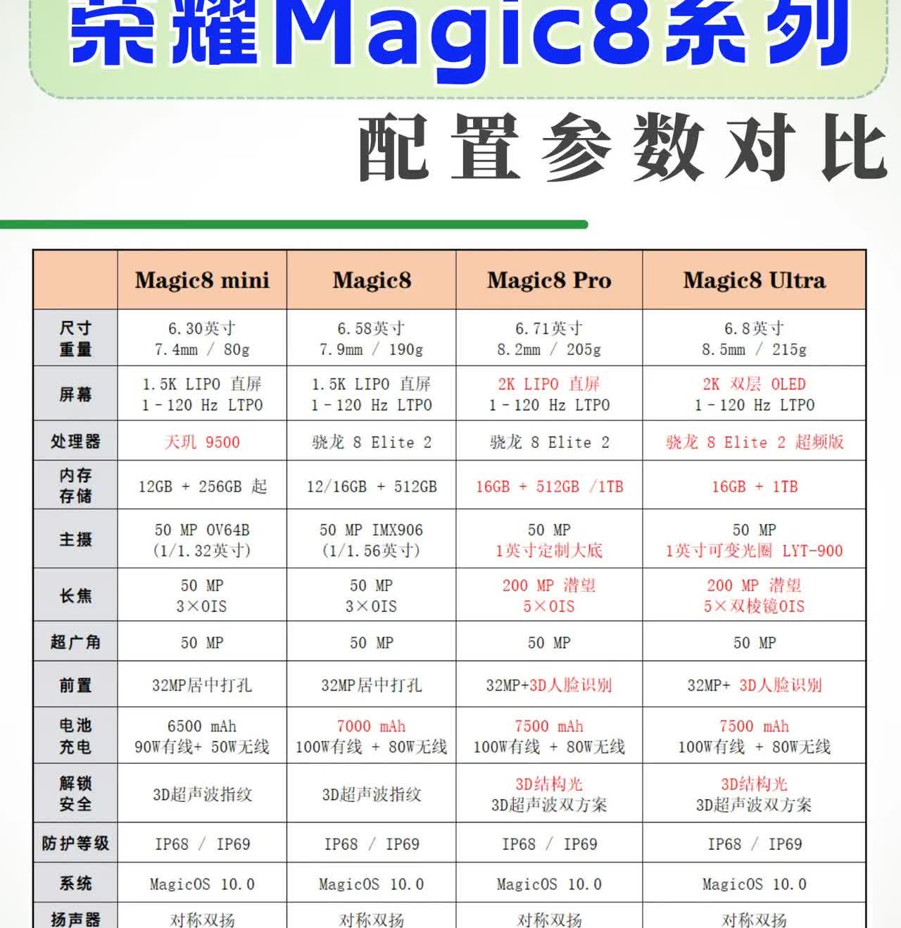 荣耀Magic8全系曝光🔥四杯+7500mAh+2亿潜望 荣耀Magic8系列终于来了,一口气四杯齐发,配置炸裂到我不敢眨眼👇 📕全系7000mAh起步,Pro直接到7500mAh!100W有线+80W无线,大电池+快充终于不打架⚡️ 📕Pro/Ultra独享200MP潜望长焦,5倍光变+100倍数码,安卓长焦📸 mini和标准版也有50MP三摄,日常完全够用! 📕Magic8 mini 6.3英寸+180g超轻薄,6500mAh塞进小机身,单手党的春天来了! 📕Pro以上独享3D结构光+3D声波双识别,刷脸刷指纹都秒开🔐 💰预测:mini 3999起,Pro 5699起,Ultra冲8K 📅预计10月初发布会! 荣耀 Magic8比Magic7的提升主要体现: 1️⃣ 屏幕:6.58"直屏+1.2mm窄边,比Magic7 更小巧 2️⃣ 续航:全系7000 mAh起,Pro直接7500 mAh,告别一天两充 3️⃣ 影像:Pro 版 200 MP潜望5×光变,暗光远摄大升级 4️⃣ 性能:骁龙8 Elite 2/天玑9500双平台,性能提升 35% 5️⃣ 解锁:Pro/Ultra新增3D结构光+声波双识别 6️⃣ 防水:IP68/IP69,机身薄 0.8 mm,颜值再进化 💡如何选适合自己的型号? - 要轻薄小屏 → mini - 要全能水桶 → 标准版 - 要影像登顶 → Pro / Ultra