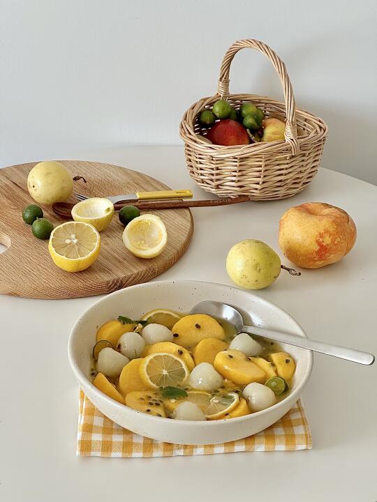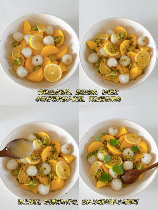 它可以称得上是夏天解暑的王炸甜品了 果香四溢,冷藏后冰冰凉凉🧊酸酸甜甜 消暑又解腻,一口下去太满足了‼️ 🍑 食材: 百香果|黄桃|荔枝|柠檬|小青柠|薄荷|蜂蜜 🍑 做法: 🤍桃子去皮切块,荔枝去皮,柠檬和小青柠切片,都放入碗里🥣 💛加百香果肉、淋上蜂蜜🍯,再加点薄荷叶拌匀 💚放冰箱冷藏2小时即可!是不是超级简单!~