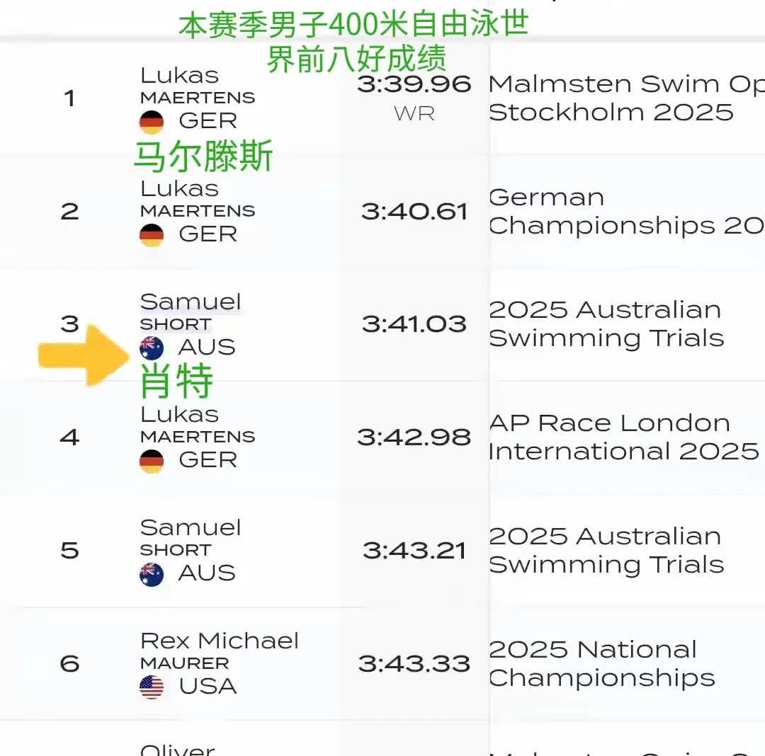 对于明晚(7月27日)的游泳首金男子400米自,绝大部分人认为德国人马尔滕斯摘得首金是板上钉钉的事,没有其它选项,但我觉得澳洲选手塞缪尔·肖特具备制造冷门的能力。 马尔滕斯今年确实游出男子400米自3分39秒96的世界记录,并且拥有本赛季的世界第一和第二好成绩,金牌应该无悬念,但澳洲选手塞缪尔·肖特3分41秒03的本赛季世界第三好成绩只比世界纪录慢了不到1.5秒,绝对有可能对金牌发起挑战,毕竟400米很难游,与临场发挥和比赛环境也有很大关系。而且在本赛季世界前五好成绩中,肖特也占到2席。