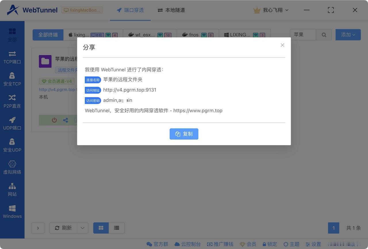 没有 NAS 的老铁看过来~[机智] 想一键将某个文件夹临时共享给互联网那一头的朋友吗? 如果只是想让对方下载,又不想搞的那么复杂的怎么办 WebTunnel 上线远程文件夹功能啦 一键将某个目录共享出去(真的就只需要 3 秒🥲) 关键是通过网页就可以访问 无论手机、电脑、信创系统都可以访问和下载 最最关键的来了:此功能无需更新客户端,刷新页面即可 GET 欢迎各位老铁使用、建议和拍砖🧱